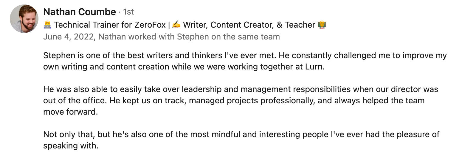 I've written for all kinds of brands, from organizations like Empire State University and TD Bank, to personal brands like Prince EA and Anik Singal.Want to see more examples of my writing? Click the button below to view them.